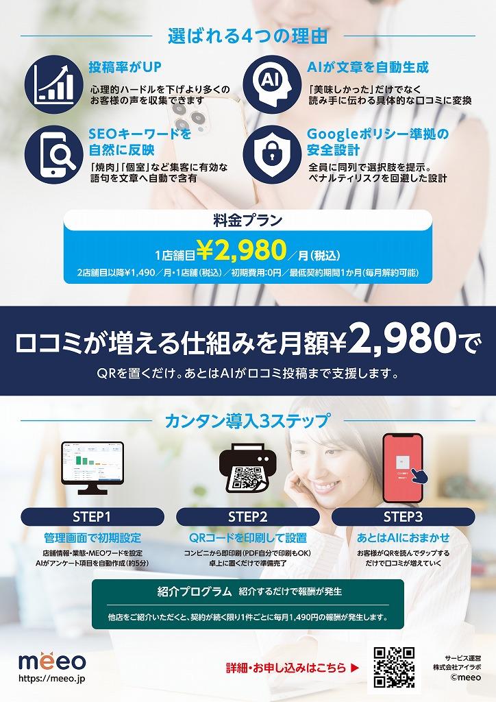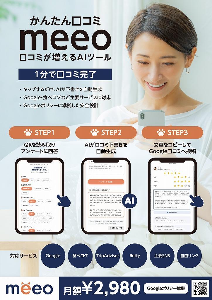口コミを増やしたいけれど、お客様に頼みづらい。そんなお悩みを解決するのがAI口コミアプリ「meeo」です。店頭のQRコードを読み取り、簡単な選択肢を選ぶだけで、AIがお客様に合った口コミ文章を自動生成。「書くのが面倒」という投稿のハードルをなくし、Googleマップの口コミが自然に増えていきます。導入は約10分の初期設定のみ。専門知識は不要で、その日から運用を始められます。さらに、2店舗をご紹介いただくと月額利用料が永久無料になる紹介制度もご用意。コストを抑えながら、MEO対策と集客強化を同時に実現できます。