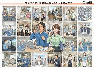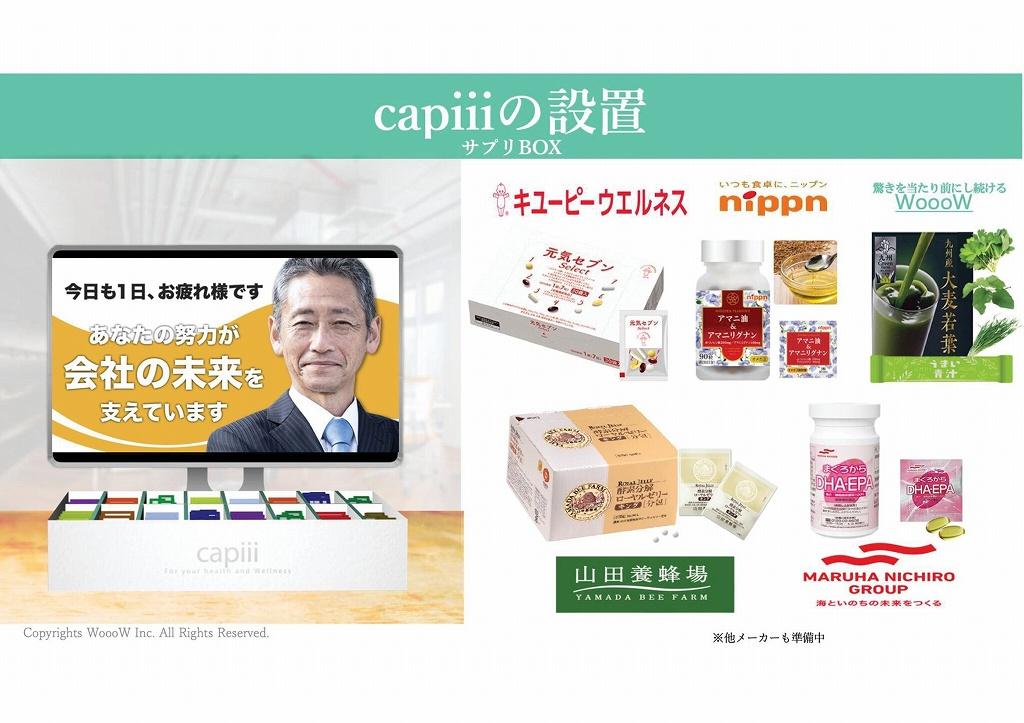 | 私たちの強み | 1. サービス提供場所・形態の差別化(VS 従来の福利厚生) 従来の福利厚生(旅行、宿泊、スポーツクラブ、ゴルフなど)は「社外」で行うものが多く、利用者が限られるという課題がありましたが、Capiiiは**「オフィス内完結型」**であることが最大の強みです。 全従業員へのリーチ力: オフィス内に設置するため、一部のアクティブな社員だけでなく、全社員が日常的に利用・接触できます。 「わざわざ行く」手間の排除: ジムや保養所に行く時間を確保できない多忙な社員でも、業務の合間に健康行動がとれます。 2. 対象規模の柔軟性(スケーラビリティ) 多くのソリューションが企業規模を選ぶ中、Capiiiは規模を問わない柔軟性を持っています。 規模不問の導入体制: 「数名のベンチャー企業」から「数百名〜数万名の大企業」まで、規模感に関係なく設置が可能です。 省スペース対応: 大規模なカフェテリアがなくても、オフィスの空きスペースに「コーナー」として設置できる柔軟性があります。 3. 解決する課題の「深度」と「目的」(VS 一般的な福利厚生) 単なる「従業員満足度(ES)」の向上だけでなく、**「経営課題の直接解決」**を掲げている点が大きなセールスポイントです。 「消費」から「投資」への転換: 従来の福利厚生費を「コスト(消費)」ではなく、生産性向上や離職率低下のための「投資」と定義し直しています。 <具体的な経営指標への貢献:> ✅離職率低下: 人間関係の希薄化に対し、コミュニケーションのきっかけ(「調子どう?」などの会話)を生み出すことで対策します。 ✅生産性向上: 健康維持によりパフォーマンスを高め、企業収益UPを目指します。 ✅企業イメージUP: 採用困難な時代において、従業員を大切にする企業姿勢をアピールできます。 4. 導入障壁を取り除く「ワンストップ性」(フォロー体制の代替) 多くの企業が健康経営を実施できない理由として挙げている「課題」を、システムとして解決しています。 ノウハウ・専門家不足の解消: 「何をすれば良いか不明」「ノウハウがない」「相談できる専門家がいない」という企業に対し、設置するだけで健康経営の「型」を提供します。 ※人手不足・担当者負担の軽減: 「人手不足」で施策を回せない企業でも、設置型サービスであれば運用の手間を最小限に抑えられます。 5. コミュニケーション誘発デザイン(製品特徴) 単に健康器具やサプリを置くだけでなく、**「コミュニケーションが生まれる場」**として設計されています。 デザインされた空間: デジタルサイネージやPOPを活用し、「調子どう?」「今日は大麦にしようか」といった自然な会話が生まれる仕掛けがあります。 視覚的な訴求: 洗練された「Health Promotion Corner」としての空間演出により、オフィスの雰囲気を明るくし、社員が立ち寄りやすい環境を作ります。 |
